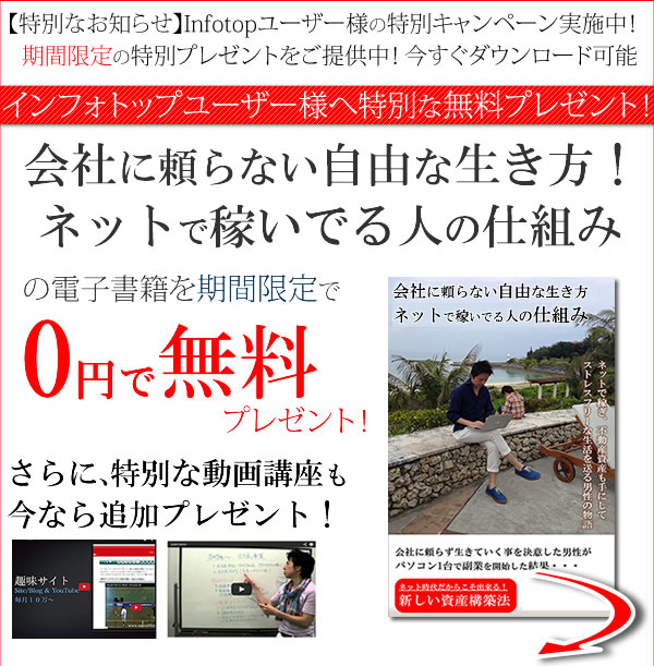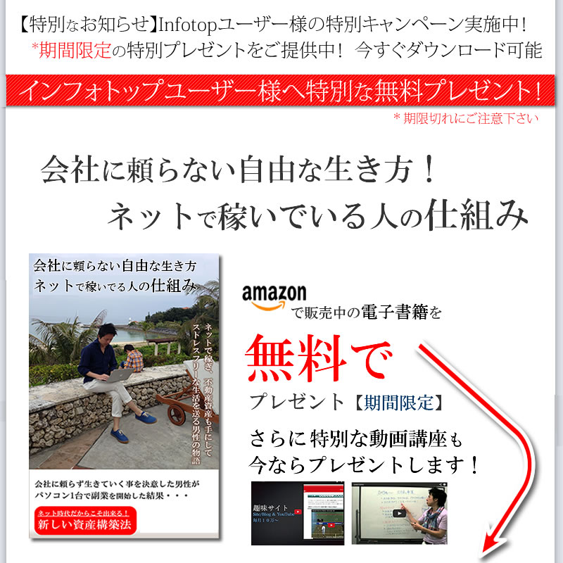 あなたのEメールアドレスを入力後『特別なプレゼントを入手する』を押して下さい。Eメールにて、自由を手にする為に初心者がすべき事を解説したPDF(電子書籍)のダウンロード先と、動画講座が見れる特別サイトをお送りします!